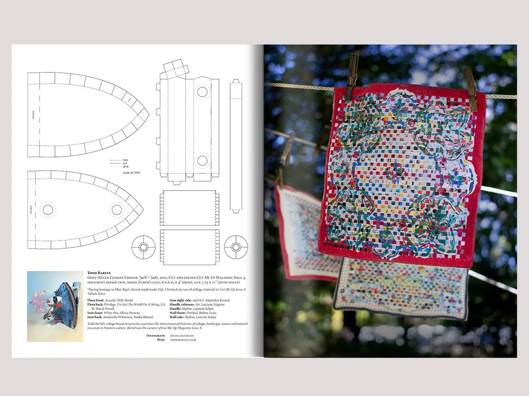 Reflecting on the history of the found object as Readymade, as well as the importance of personal objects within our pandemic landscape, the artists in this issue have created artworks that serve many functions. There are objects of comfort, remembrance and protection. There are objects of play, several that can be assembled by Cut Me Up readers. Artists explore physical material as possibility, inspiring us to build, and to rebuild. Artists also explore the transformative potential of waste materials, objects we use and dispose of.